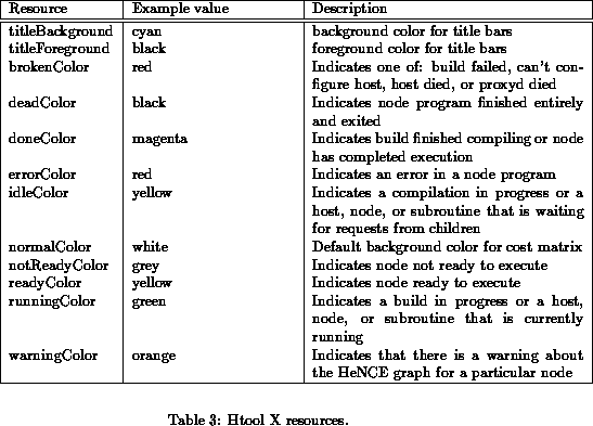 The degree to which htool can be customized may seem overwhelming at first. One should remember, however, that all of the X resources have reasonable default values and if your installation of PVM and HeNCE is canonical then no changes to these resources should be necessary.