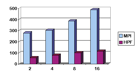 Figure 3: The MPI & HPF implementations on the SP-2 for n=1024.