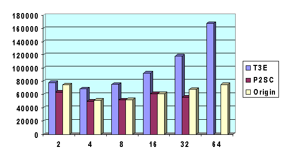 Tests for the Cray Origin 2000 were run on a 128-processor machine located in Eagan, Minnesota. Each processor is a MIPS R10000, 195 MHz microprocessor with a peak theoretical performance of 390 Mflop/s and a 4 MByte secondary cache. Each node consists of two processors sharing a common memory. The communication network is a hypercube for up to 32 processors and is called a "fat bristled hypercube" for more than 32 processors since multiple hypercubes are interconnected via the CrayRouter. The node-to-node bandwidth is 150 MBytes per second and the maximum remote latency in a 128-processor system is about 1 microsecond. For more information see [9]. A pre-release version of the Irix 6.5 operating system, MPI from version 1.1 of the Message Passing Toolkit, and the MipsPro 7.20 Fortran compiler with -O2 –64 compiler options were used for these tests.